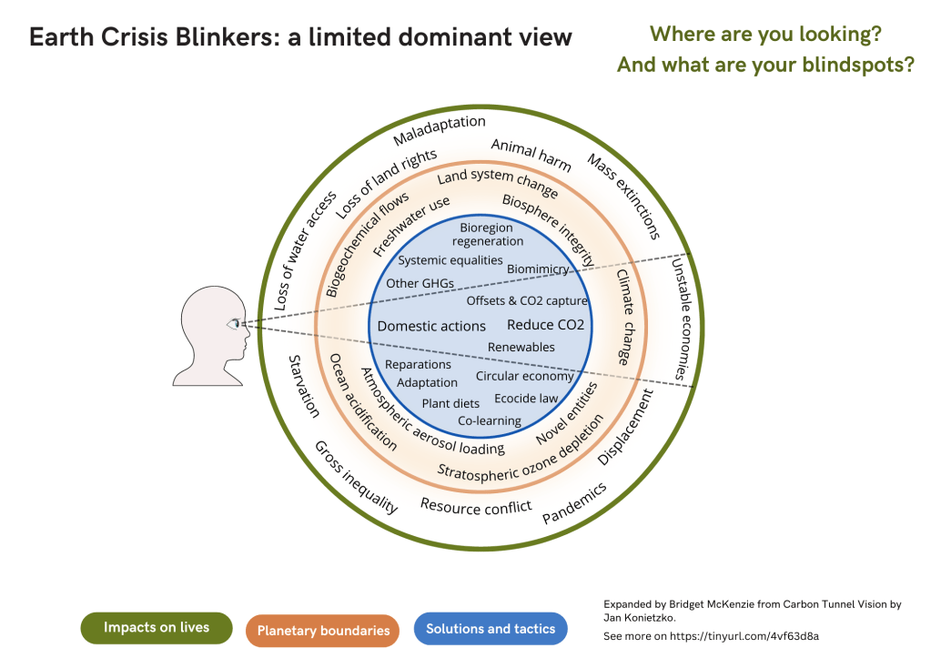 Another alignment between the guiding principles of CMUK and Daybreak is the recognition that the ecological emergency is about much more than carbon emissions. Bridget McKenzie’s adaption of Jan Koniezko’ s Carbon Tunnel Vision demonstrates the importance of understanding the limiting effect of Earth crisis blinkers.