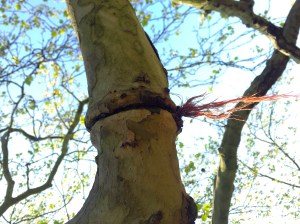 Plane tree branch constrained with string