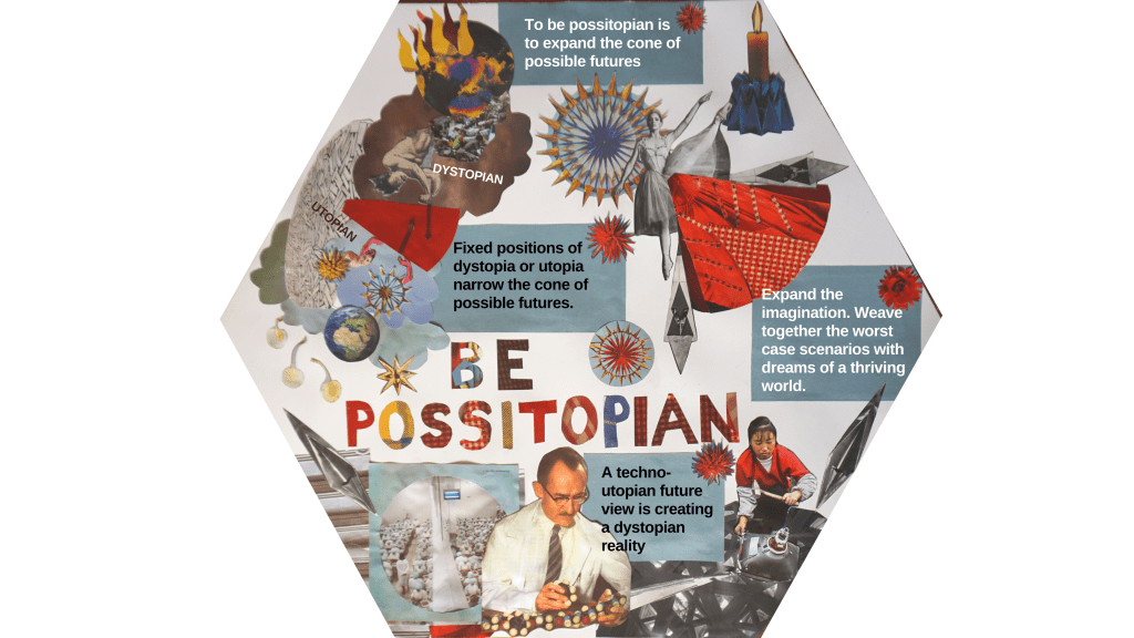 Possitopian thinking maybe offers a field rather than a path. It helps you resist predefined or hackneyed visions. We already know images of dystopia and utopian from movies and advertising. There may well be utopian and dystopian patterns which form out of cultural tropes (e.g. tech will save us) and psychological states. Possitopian approaches don’t try to create a third trope but to overcome fixed, limited and binary ways of thinking. Many people might flip from dystopian to utopian visions – drawing on what culture has offered them – depending on their feelings at any moment. Possitopian practice allows us to imagine new possibilities by talking and weaving together rather than flipping helplessly.