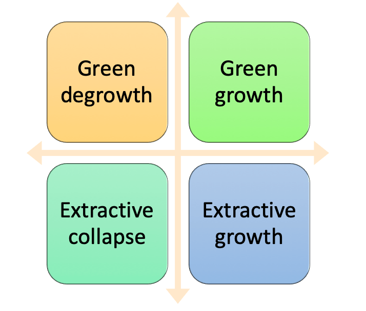 There are some classic methods for speculative futures. The default mode we mostly fall into, without facilitation, is to flip between two poles of ‘hopes’ and ‘fears’ or dystopia and utopia. Business management methods lay a matrix onto a future time e.g. the diagram here, and invite people to imagine what each quartile looks like and which is the most desirable and achievable. This is called Scenario Planning.