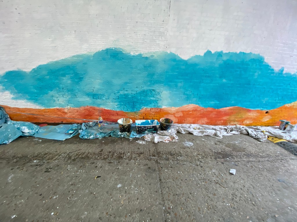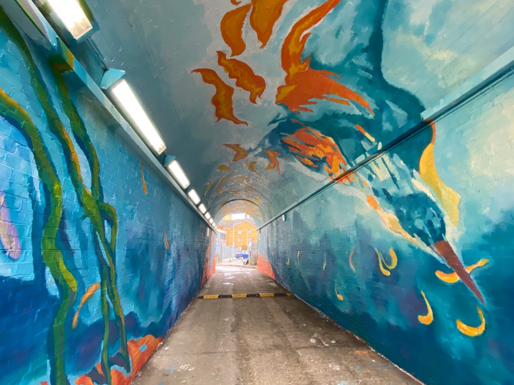 I wanted to see how the mural was developing so cycled to the painted version of the river with its large Kingfisher and canopy of colour. It was very impressive and satisfying to know I had left a small positive mark in the landscape.