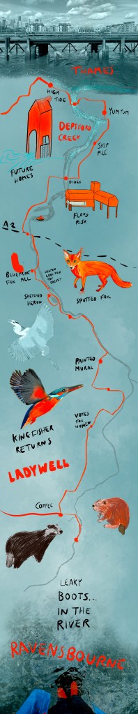 I started earlier with the aim of making it to Ladywell and find out what happened after Elverson Road. Following Sustrans route 21, the Waterlink way past a strange sequence of tyres suspended across the river. I later read this was an art installation intended for birds to nest in the disused rings of rubber and was going to be taken down on an ecological basis. The cycle path led me through a tunnel and I was amazed to see a group of artists painting it. The Lewisham School of Muralism allowed me to contribute a small patch of blue, as they transformed the tunnel into a view from the bed of the Ravensbourne river. This was an unexpected but exciting pause which involved making connections with part of Lewisham’s creative community. Crossing into central Lewisham, there were glimpses of the river at Cornmill Gardens before it became inaccessible on the route to Ladywell. Finally rejoining the river at Ladywell Fields, I found an opening in the trees, and veered onto a muddy route off the path to get into the water. At last I was actually in the Ravensbourne, it felt so refreshing, and I discovered my wellies also had a leak. I later documented these journeys with a map and some drawings.