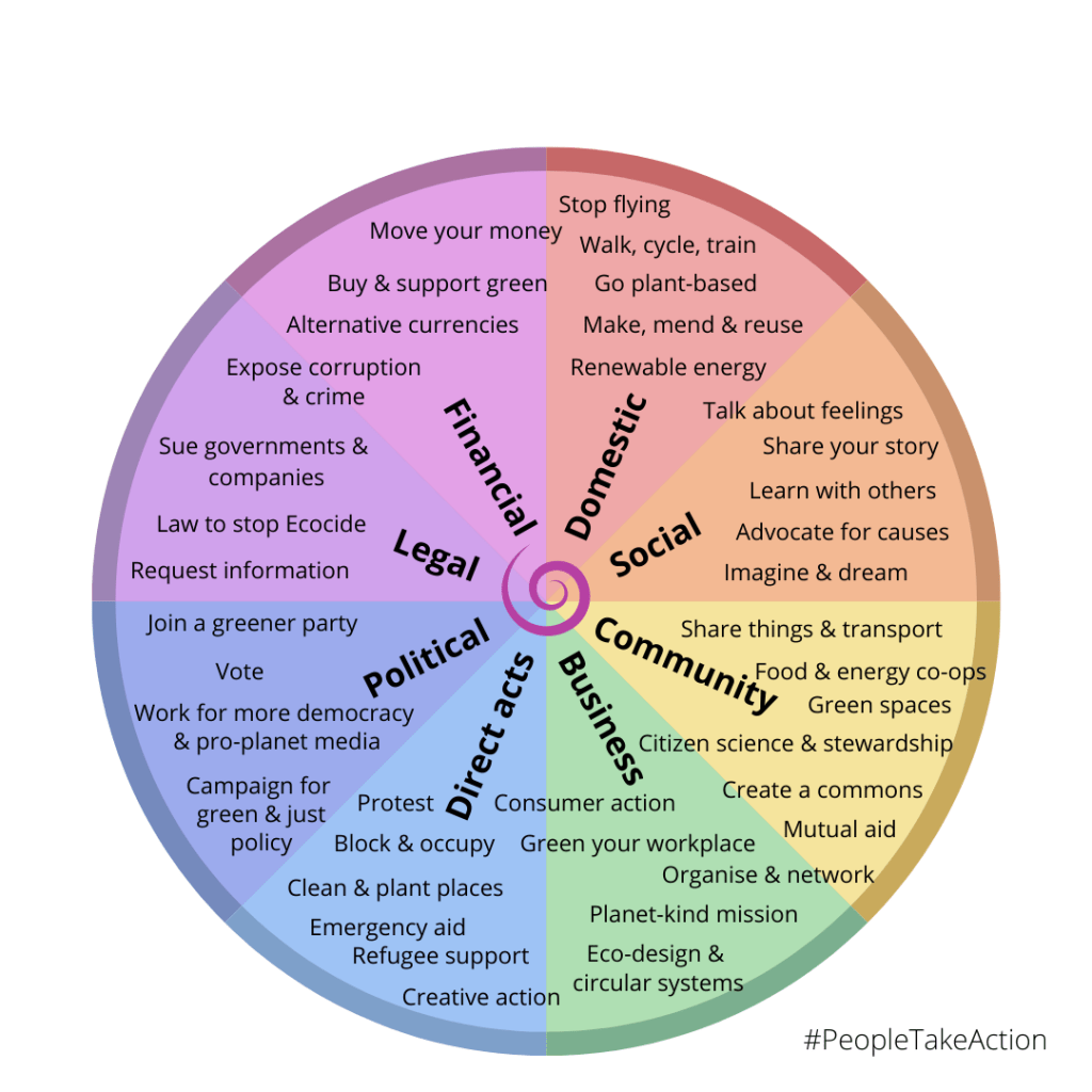 This model and toolkit offers eight pathways for people to take action on the Earth crisis in any area of influence they have. It aims to expand thinking about what action is possible. It sees all actions as ‘personal actions’ within our blended lives as consumers, friends, citizens and workers.