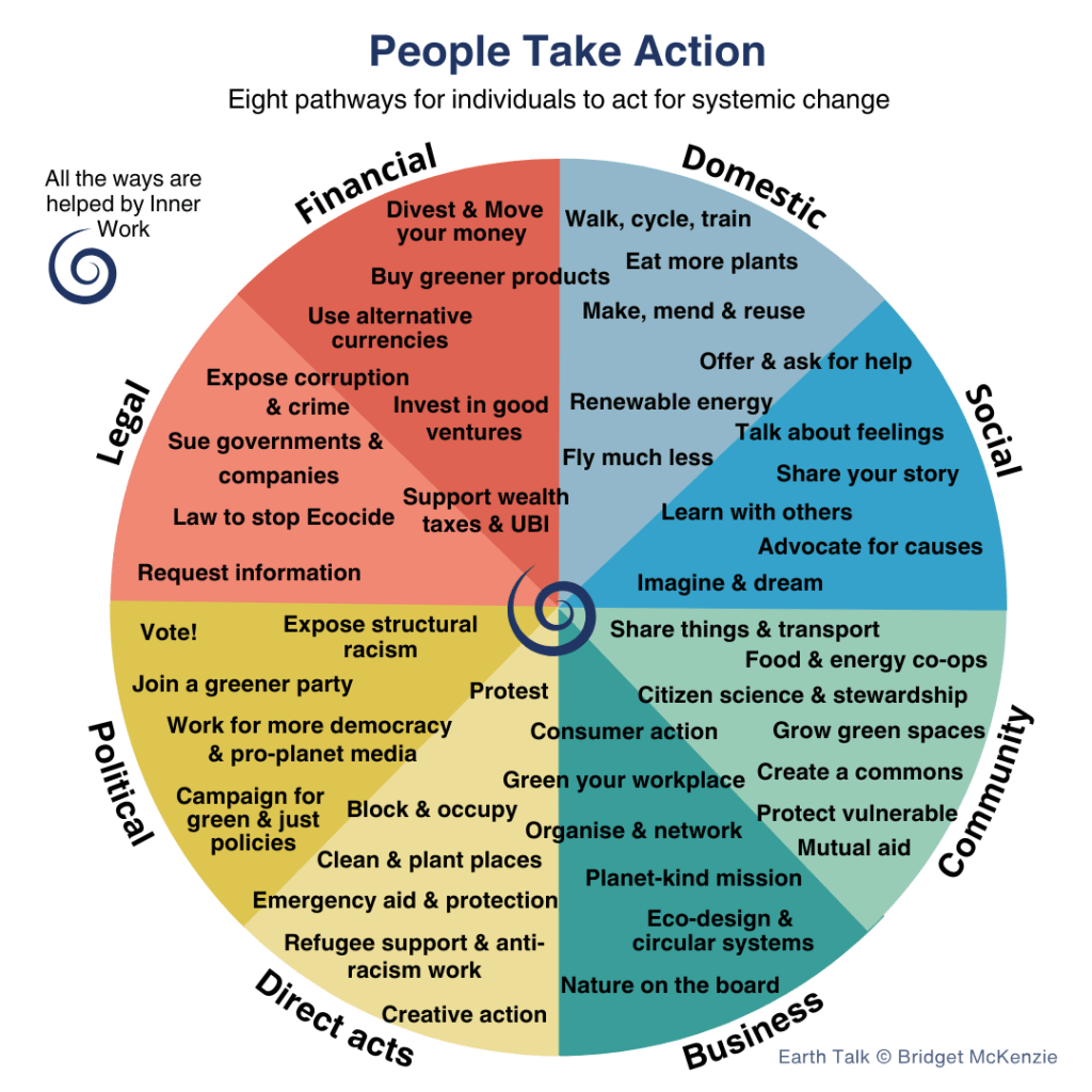 Do they make you feel better, as they’re supposed to? Or do you feel overwhelmed? Maybe you already do most things on the list and you know about the rest. Perhaps you’re involved in a group, campaign or local community action and you want something to motivate and challenge people. Or, do you get frustrated with limited ideas about what action is possible? These limited ideas lead to binary arguments such as “personal lifestyle action versus big system changes”.