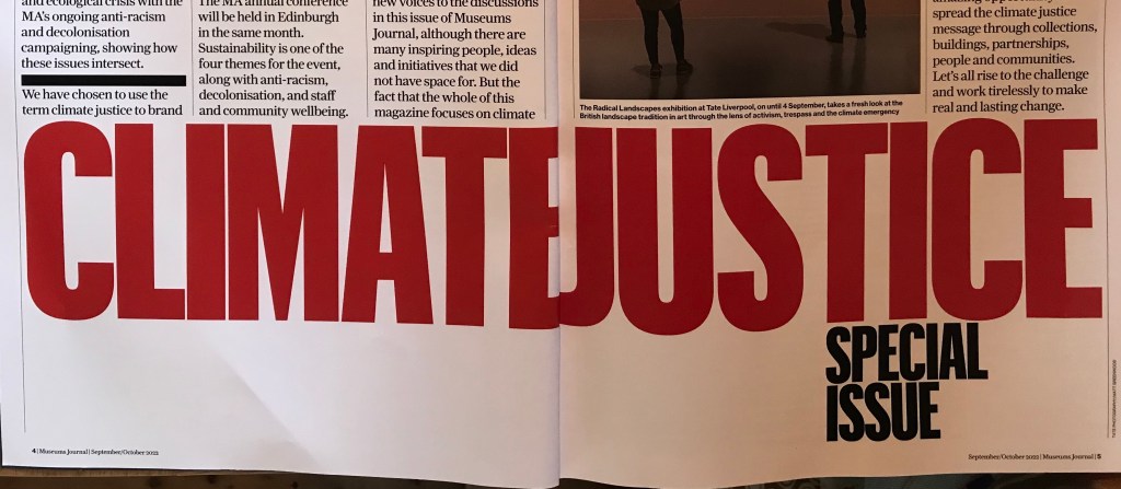 Nevertheless, by even acknowledging the justice issues of the Earth crisis, climate justice still presents a stimulating framework for museum action. This bold decision on the part of the MA does more than simply entreat museums to reduce their carbon footprint. It challenges them to adopt an anti-establishment view. To reimagine power structures. To amplify suppressed voices. To instil care and wellbeing into their practices.