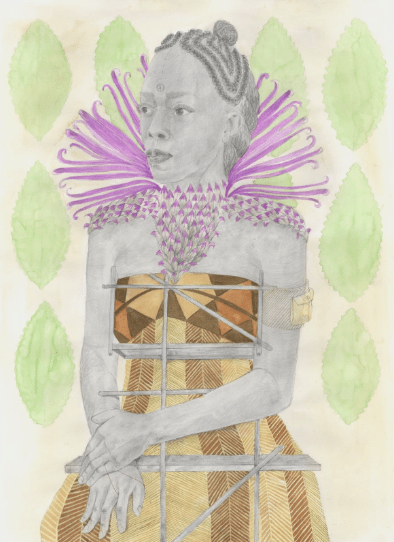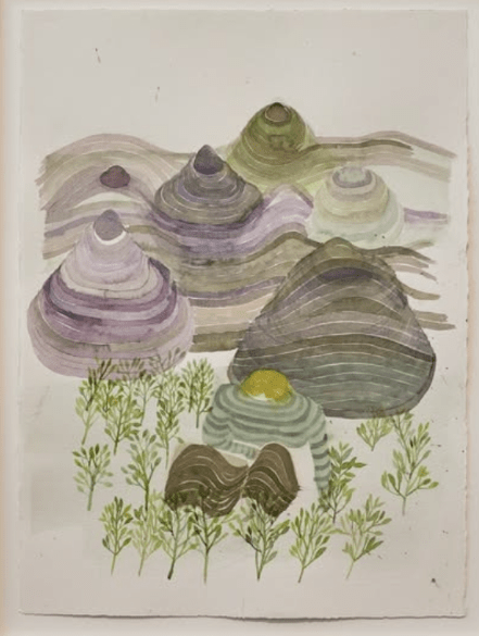 Left: Charmaine Watkiss, The warrior focuses intent to overcome adversity, 2022. Right: Sally Payen 2024, Core Sampling with Mountain View. Watercolour on handmade paper.