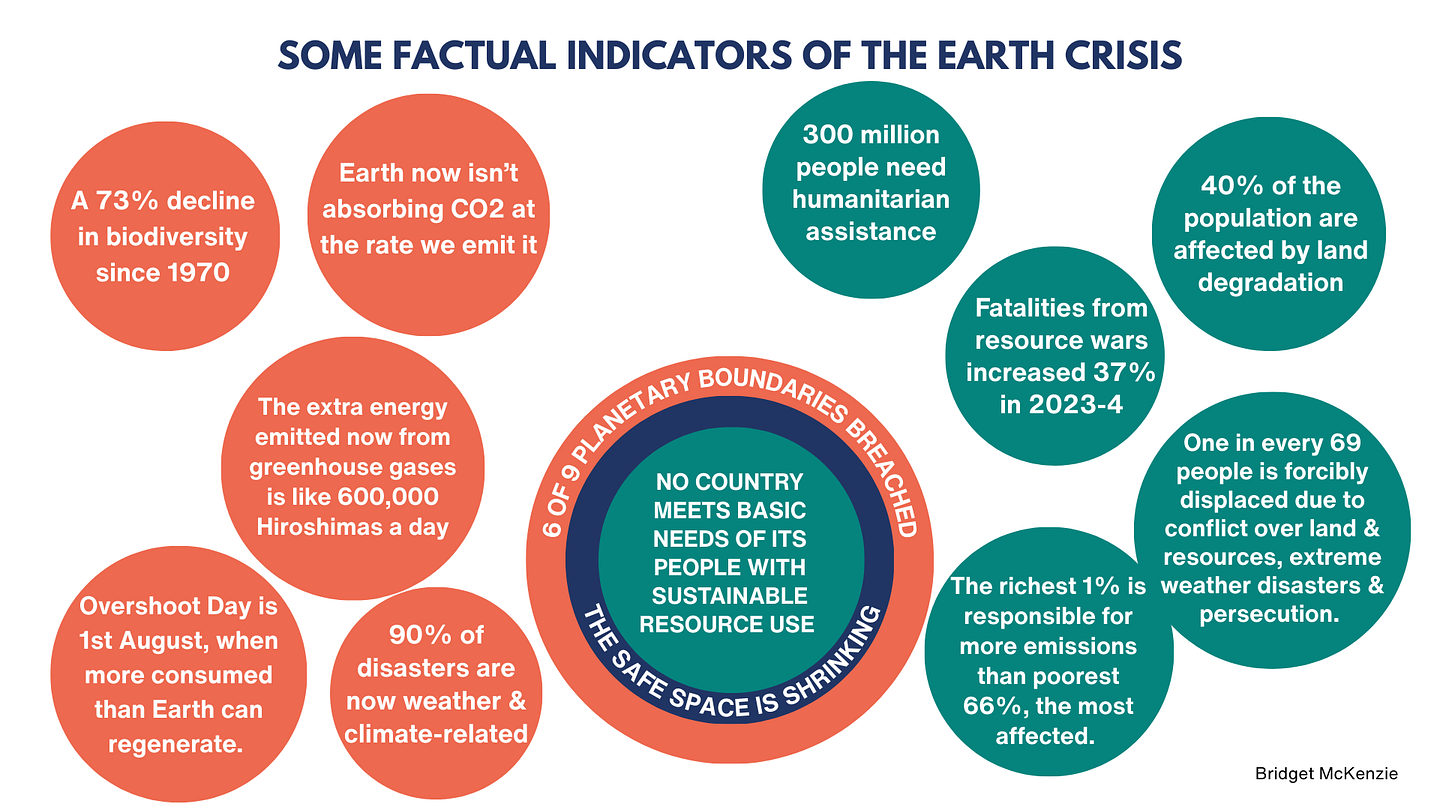 CARING: Responding to the Earth Crisis means seeing how social shortfall is entangled with ecological overshoot, due to the extractive capitalist system that profits from harming and othering bodies and places. The meta-challenge is to meet the needs of people and their biodiverse kin with justice while restoring Earth systems and dealing with the impacts of 6+ planetary boundaries being breached. So, an Earth Crisis response requires paying more attention to risk assessment and community care in the face of impacts.